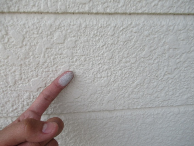現場でのチェックポイント: 外壁を軽く擦り、指に同じ色の粉が付着するかどうかを確認してください。(初期段階では目視で分かりにくい場合があります。)