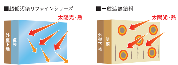 さらには、遮熱保持性という他の遮熱性にはない機能を有しているのも特徴。一般遮熱塗料は経年とともに付着した汚れが熱を吸収するため、徐々に遮熱効果が低下していきます。しかし、超低汚染リファインシリーズは美しさがずっと続くため、汚れによる熱の吸収を防ぎ、一般の遮熱塗料より長く遮熱性を発揮できます。