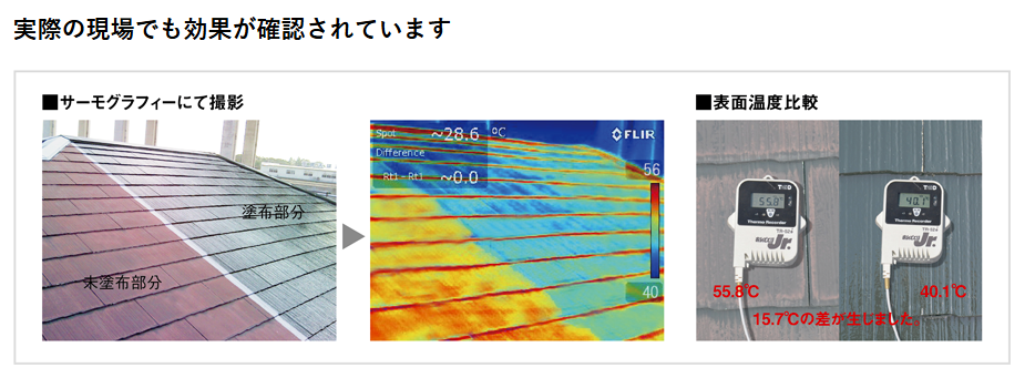 アステックペイントでは、主力商品である「スーパーシャネツサーモ」や「超低汚染リファイン」シリーズが遮熱塗料として、この遮熱効果を高く評価され、遮熱塗料でNo.1のシェアを獲得しています。