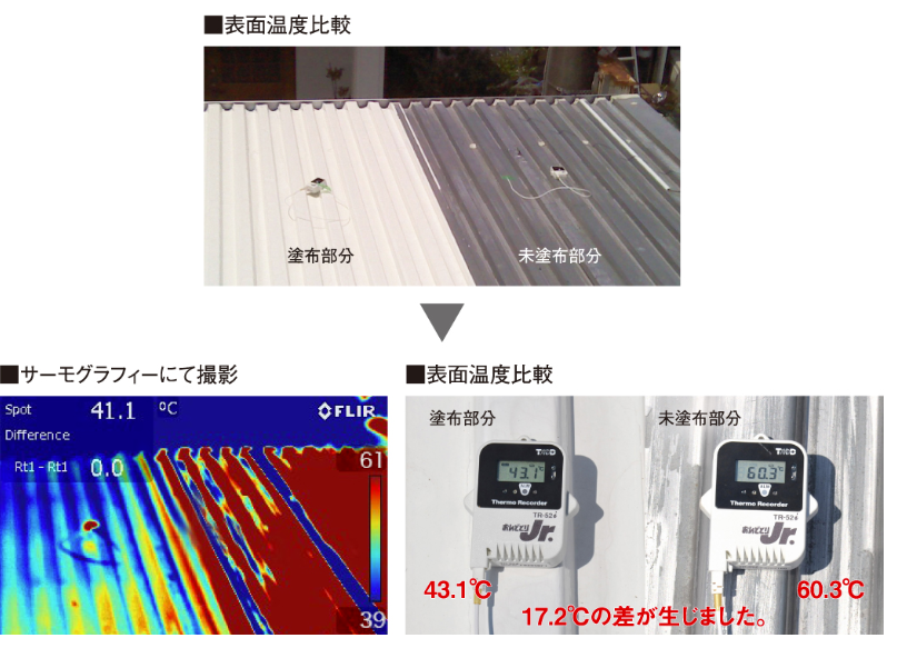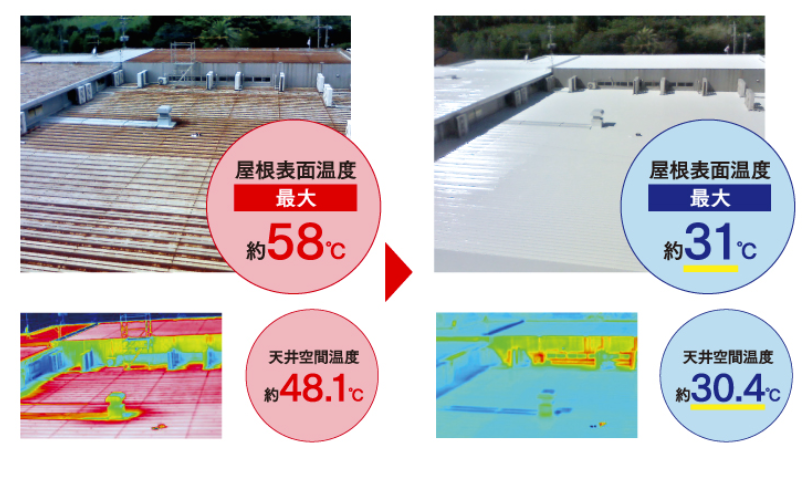 気温の高い夏場にシャネツテックⅡシリーズの施工前後の温度を測定した結果、屋根表面では27℃、天井空間では17.7℃の温度差がありました。