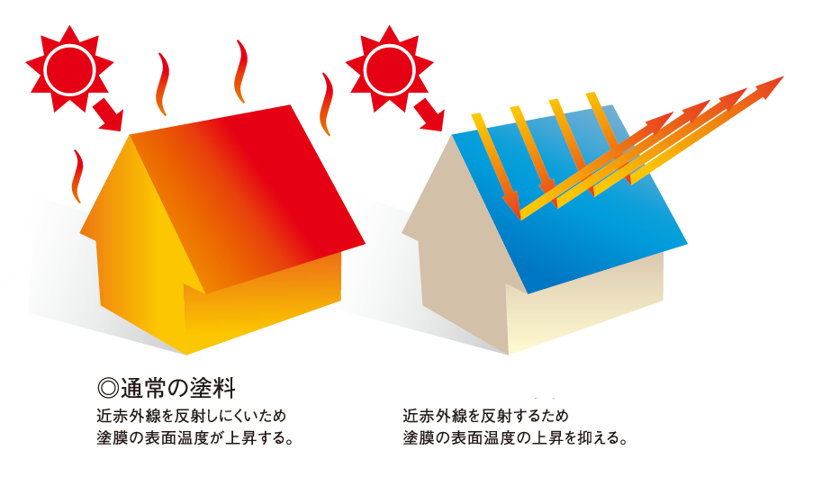 「遮熱性」とは、太陽光に含まれるこの近赤外線を効率よく反射することで、建物の屋根や外壁からの熱の侵入を抑え、建物の屋根・外壁の表面の温度上昇を抑制する性能のことを言います。