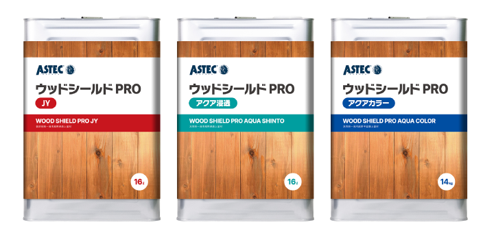水性で浸透タイプのウッドシールドPROアクア浸透、弱溶剤で浸透タイプのウッドシールドPRO-JY、水性で半造膜タイプのウッドシールドPROアクアカラーの3種類があります。