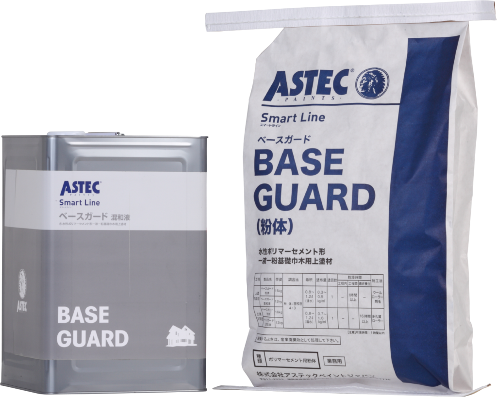 ベースガード 1液1粉水性ポリマーセメント形 無機フッ素 10~12年相当 「中性化抑止」「伸縮性」「高耐候性」によって基礎部の耐久性を向上させる基礎部専用塗料