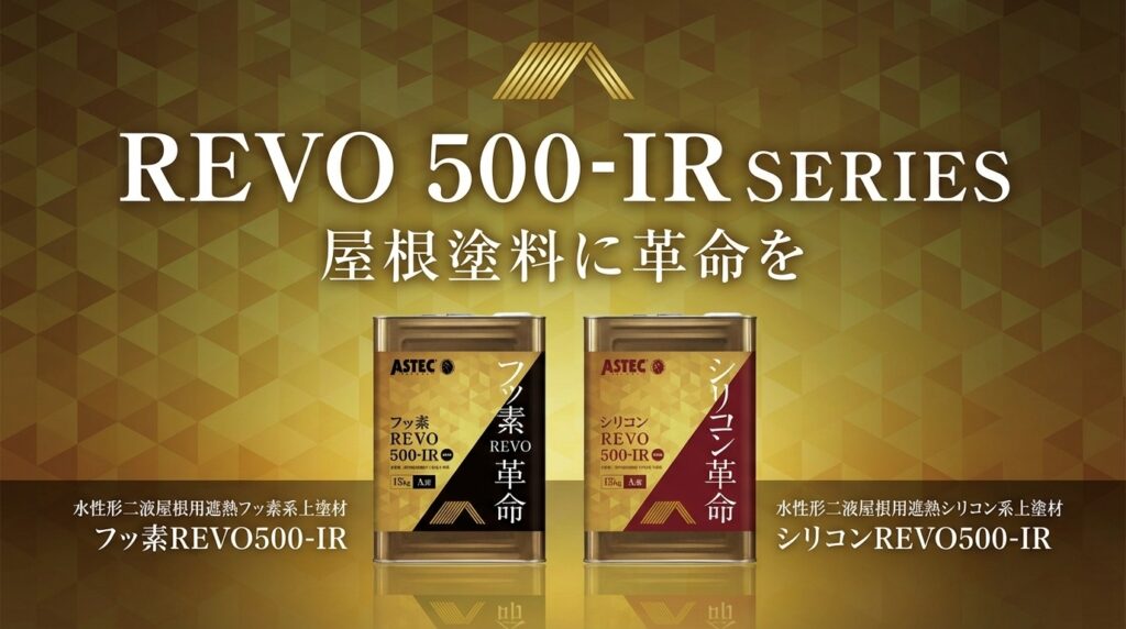 ご愛顧いただいているREVOシリーズに待望の屋根用ラインナップが追加されました。今回は「臭気が気になりにくい水性塗料を使いたい」・「既存塗膜のちぢれを防止したい」・「アスファルトシングルへ塗装したい」「高耐久塗料で差別化したい」などのご要望に対応可能な水性形2液屋根用遮熱上塗材「フッ素REVO500-IR」をご紹介します。