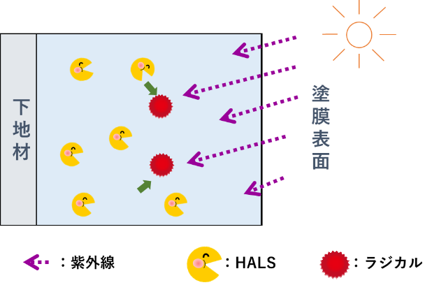 HALSとは、樹脂の劣化により発生するラジカルを捕捉する添加剤です。HALSを配合することで、劣化要因であるラジカルを抑制することができます。
