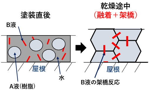 フッ素REVO500-IRは、塗料が乾燥する過程で樹脂の融着に加えて、B液の架橋反応による樹脂の結合で強固な構造を実現します。
