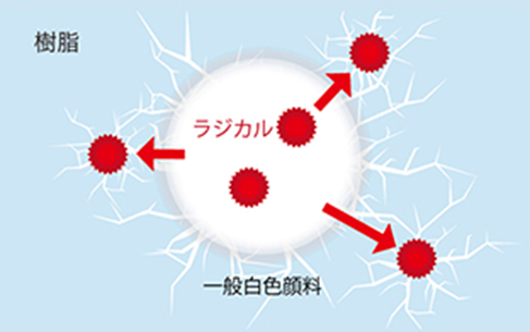 ラジカルとは、塗料に色を付ける顔料の主成分である「酸化チタン」が、紫外線の影響を受けることで発生する劣化因子です。このラジカルが発生すると、樹脂の結合が破壊され、塗膜の劣化が進行してしまいます。