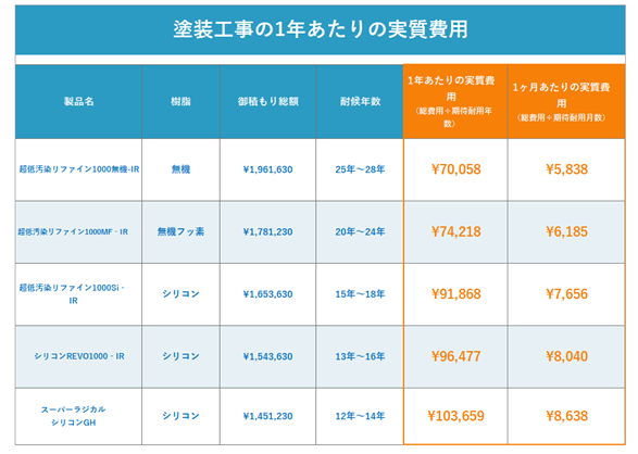 「1年あたりの実質費用」と「1か月あたりの実質費用」を5プラン(リファイン無機・リファインMF・リファインSi・シリコンREVO・ラジカルシリコンGH)で比較することで、初期費用だけでなく長期的なコストメリットを明確に伝えています。