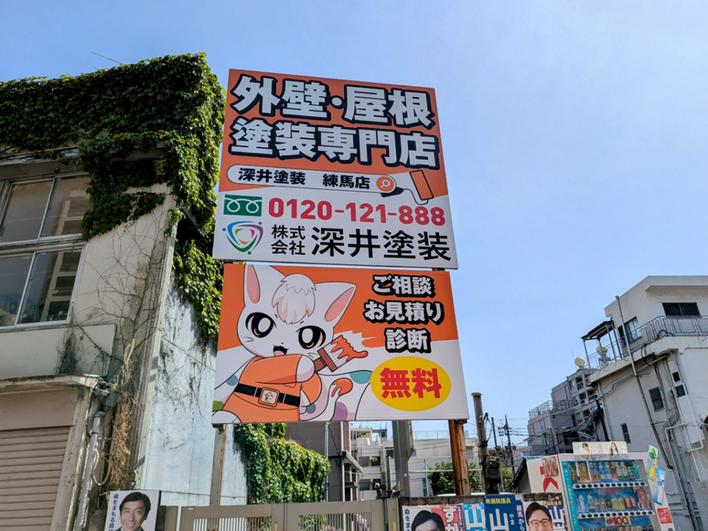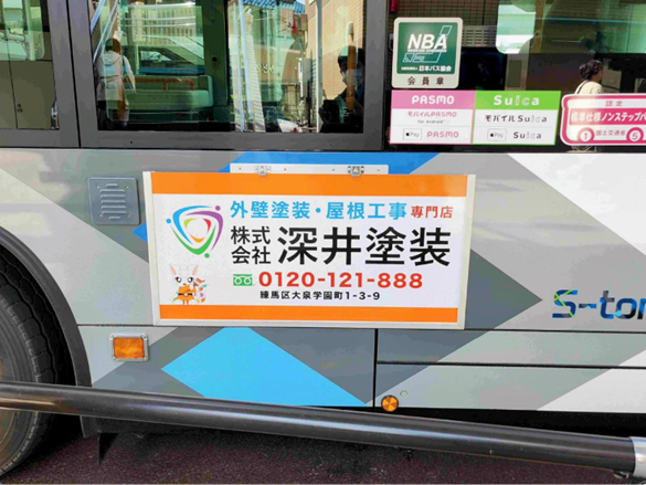 バス広告は練馬区内にて14台走っており、野建て看板も4つほど設置しました。練馬区はバスの数も多く生活していれば必ず目にするものですので力を入れています。野建て看板も練馬駅周辺や大通り沿いに設置をしています。まずは施主様が塗装を考えた時に最初に深井塗装を思い出す状態にしたいと考えています。